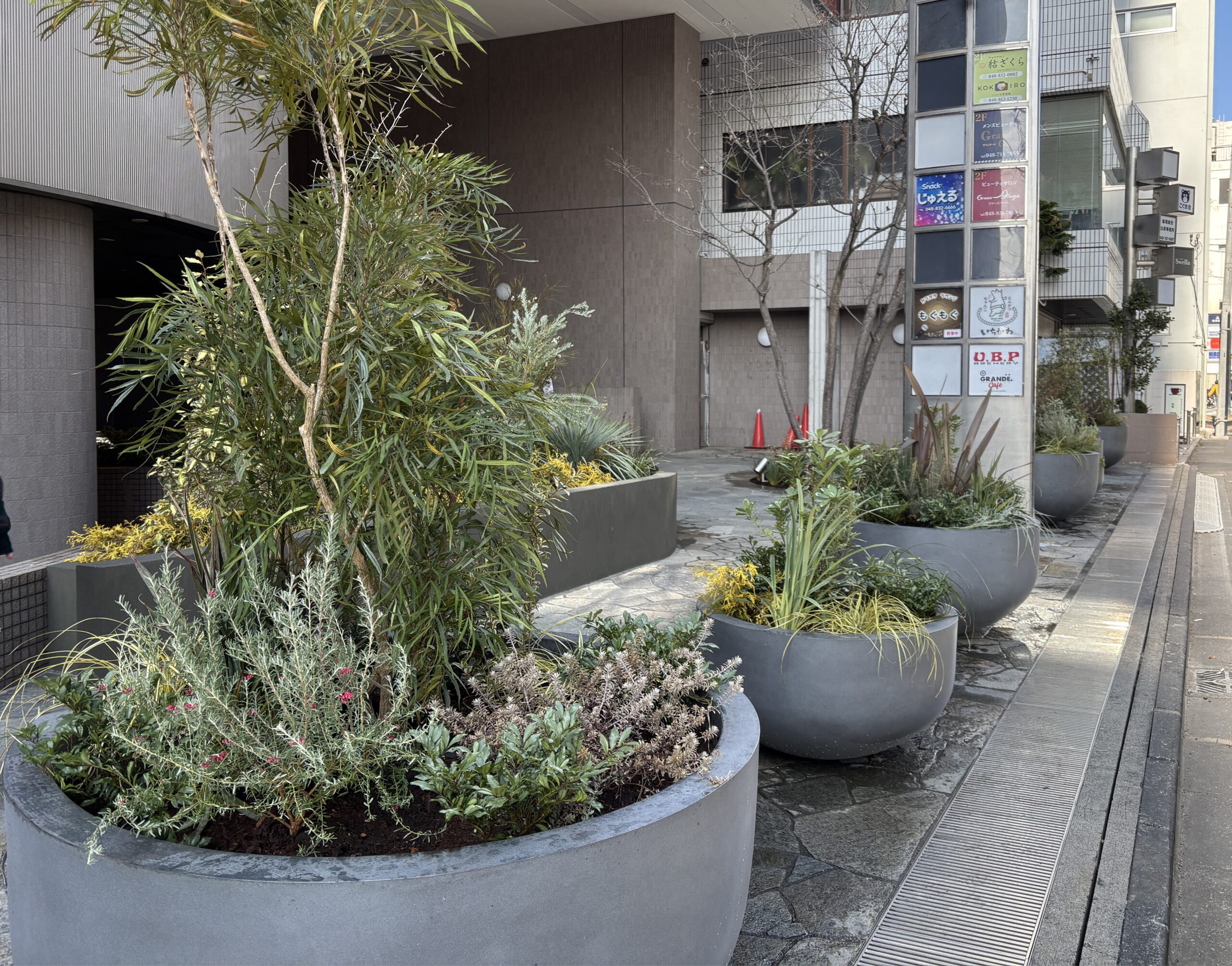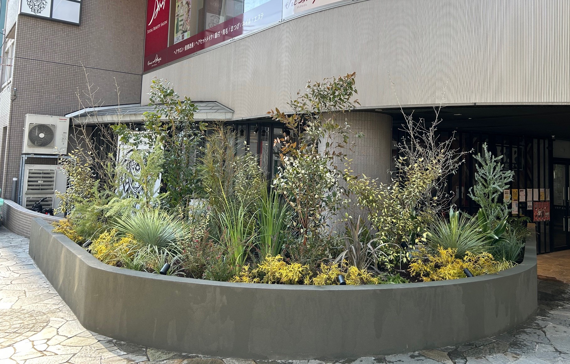 生の植栽、アーティフィシャルグリーンを使い分け、